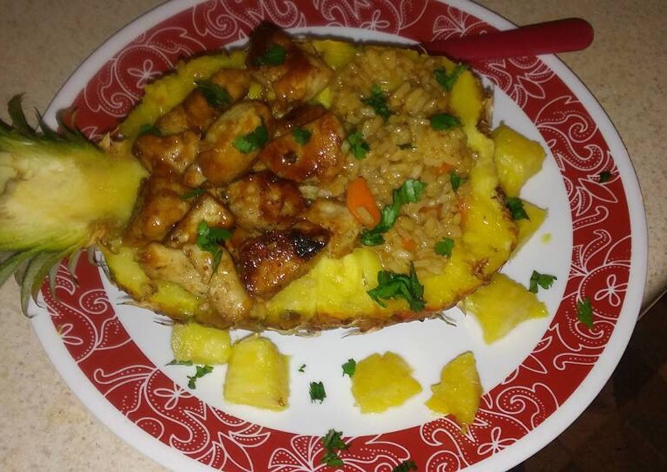 - Cook rice as directed to on box and mix rice with half of the glaze and toss chicken in remaining glaze and fill up your pineapple bowl !