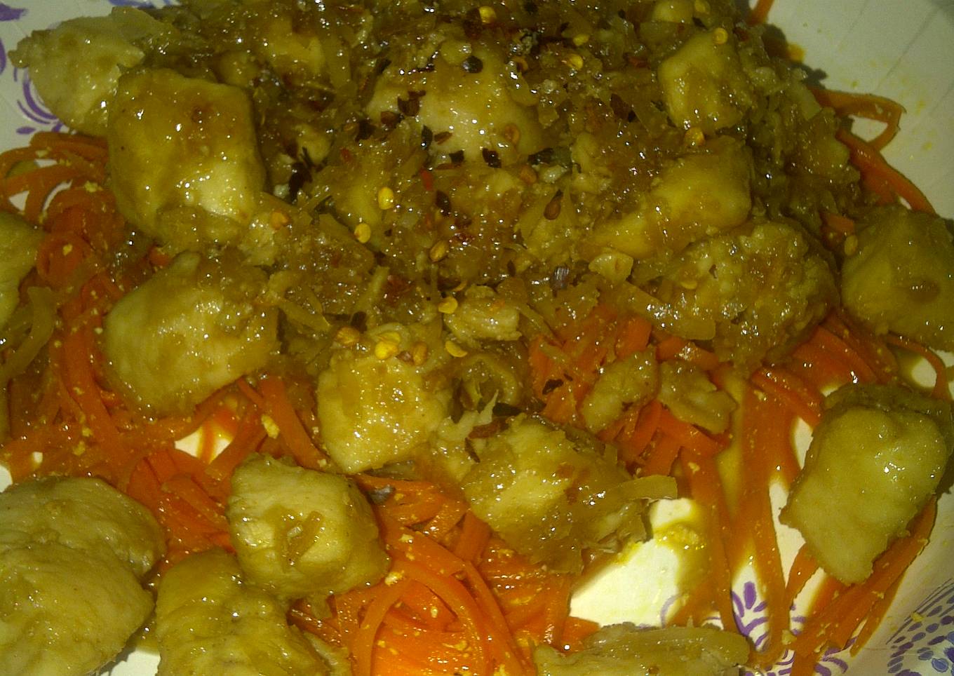 - I served with carrot noodles sauteed in the leftover oil I fried the chicken in. I also topped off with red pepper flakes, this is optional i really liked the extra heat!