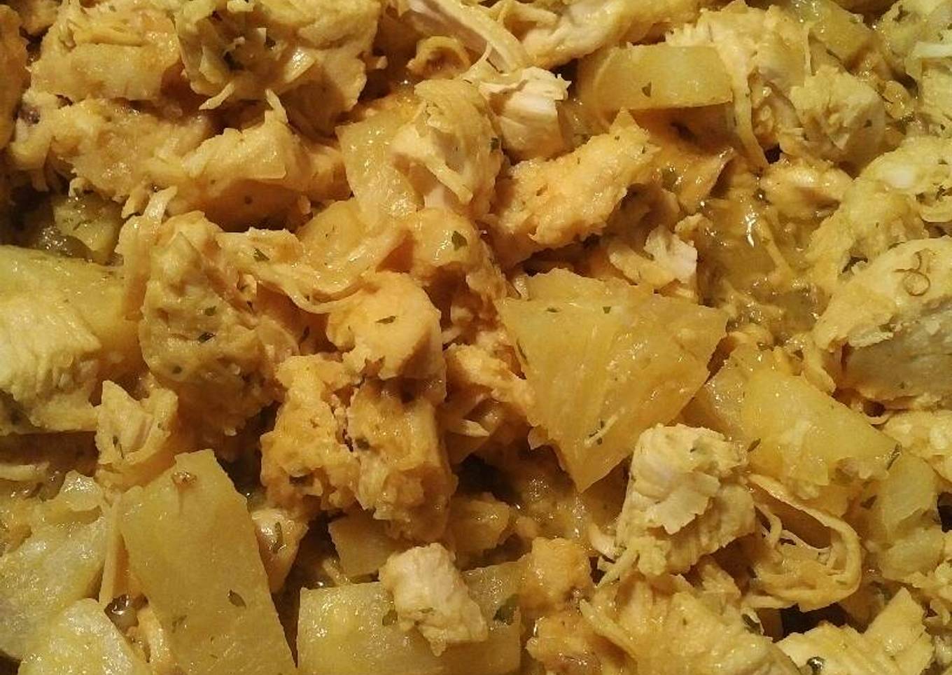 - Cook the chicken in a pan. Add pineapple, spices, garlic, orange juice, and onions