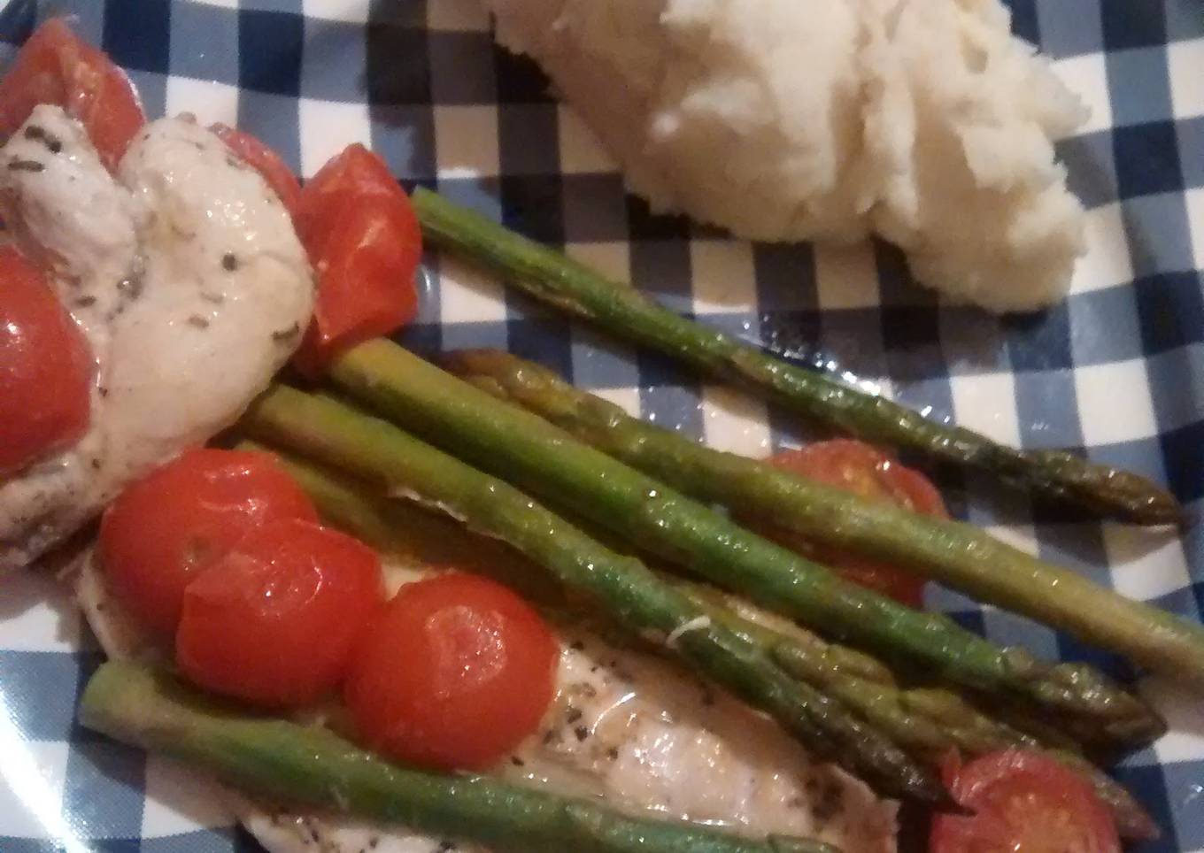 Steps to make to make Roasted chicken breast with cherry tomatoes & asparagus